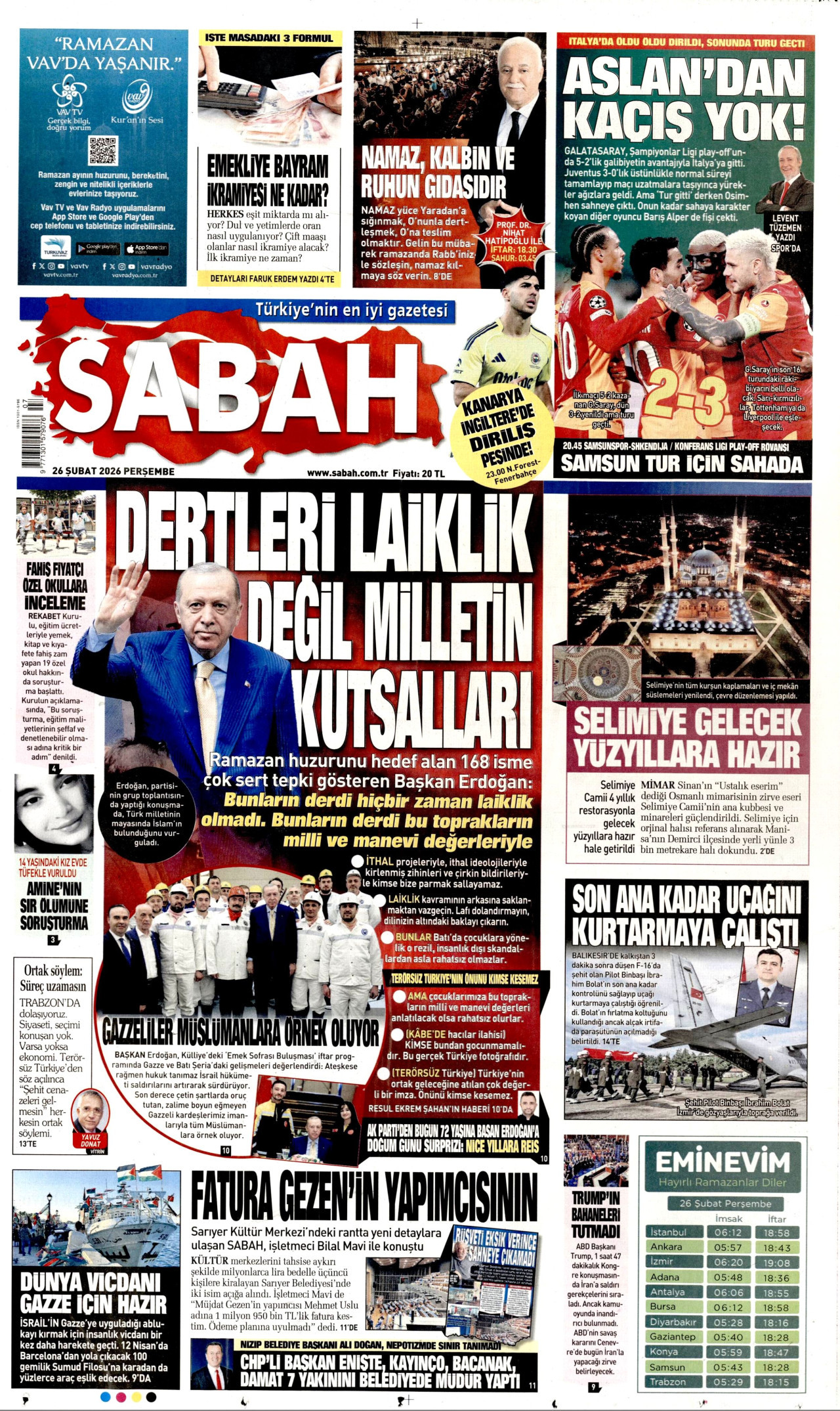SABAH Gazetesi 26 Şubat 2026, Perşembe Günü Manşeti